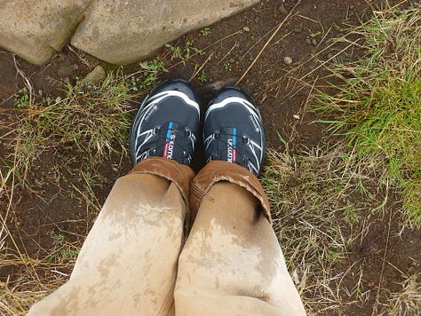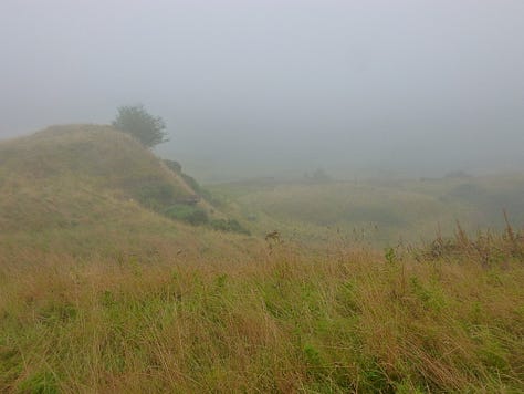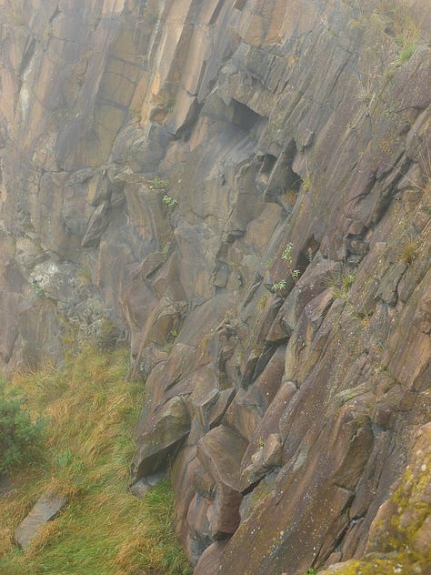 Soon after I carried on the seemingly middle-of-nowhere trail, a dog ran up from below, which instantly dissolved my lingering worries. I guess that’s where everyone regularly takes their dogs and goes on hikes. I took the next steepest path up and finally made it back to the ridge, only this time it dropped off in a rocky cliff. I got right up to the edge. My pants were soaked from walking through the grass. Good thing I got waterproof shoes. Someone had a Target dog whose bark later down in the valley boomed as it resonated off the hills. Down in the valley, I chose a path that went through Hunter’s Bog. I didn’t see much of a bog but it sure was muddy, and the mist made it feel magical. I came out the other end almost where I entered, and checked out the 11th century church ruin before I left. There was a woman taking self-timer pictures of herself posing in front of it for most of the time.